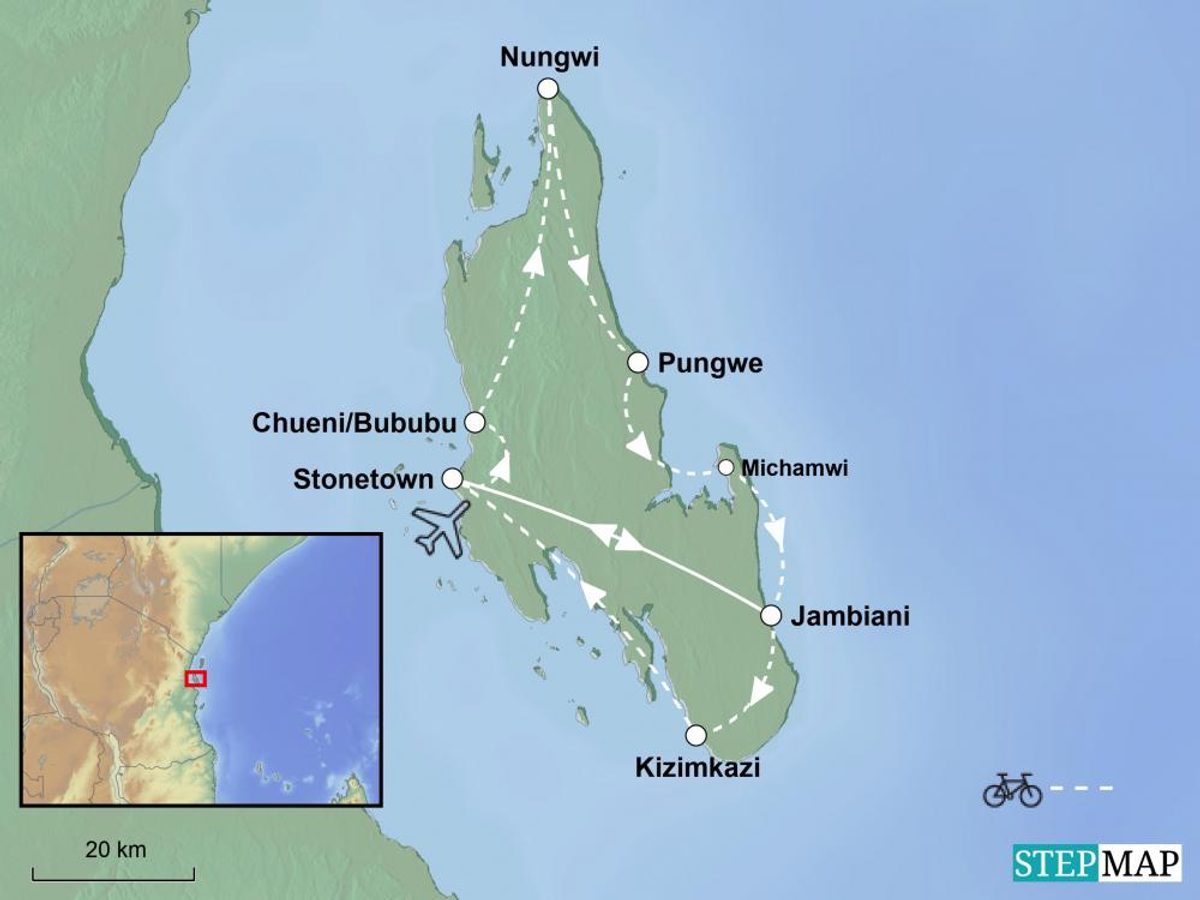Mit dem Rad einmal die Insel umrunden. Insgesamt 6 Radtouren von 9 bis 42 km Länge führen euch über die gesamte Insel. Ihr werdet palmengesäumte weiße Sandstrände genießen, exotische Welten über und unter Wasser bestaunen und die lebendige Hauptstadt Stone Town erleben. Sonnenuntergänge im Indischen Ozean und der Besuch authentischer Dörfer gehören ebenfalls zum Programm unseres Guides.