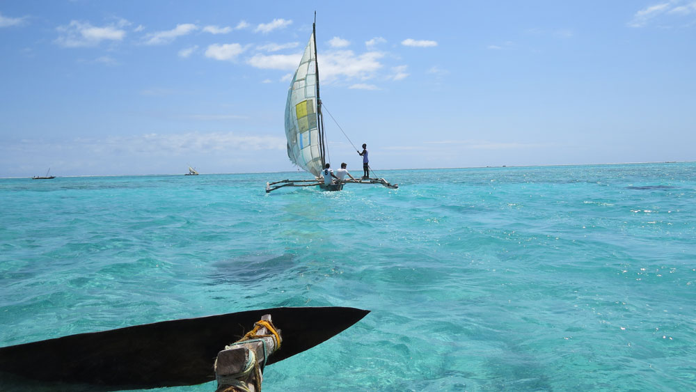 bevor wir unseren Kapitän treffen, der uns mit seinem Boot über die Kiwani-Bucht nach Fumba bringt. In Fumba angekommen, genießen wir die Mittagspause mit dem Essen aus unserer Lunchbox, da es in dieser Gegend keine Restaurants gibt. Nach einer kurzen Radtour in Richtung Stone Town steigen wir in einen lokalen Bus (Dala-Dala oder Carry) um dem schlimmsten Verkehr rund um Sansibar-Stadt zu entgehen.