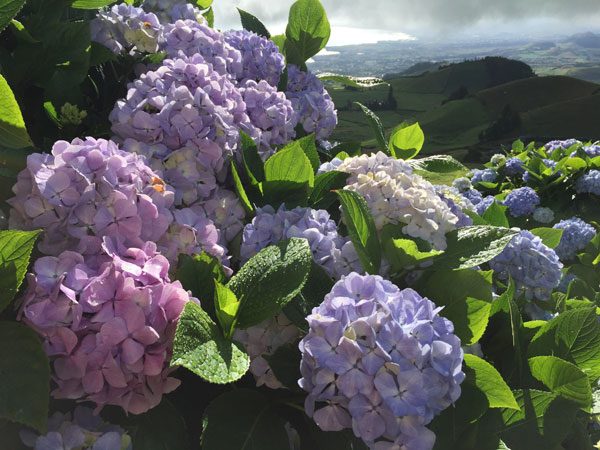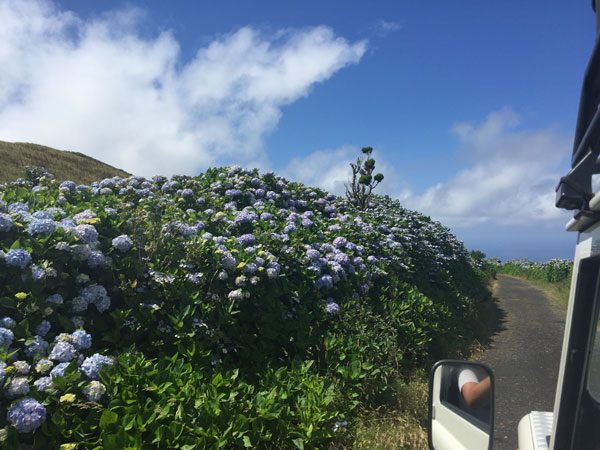 Noch ganz berauscht stiegen wir mittags in zwei Jeeps und fuhren hoch zur Caldeira, dem Riesenkrater im Landesinnern. Wir lernten, dass „Flamengos“ nichts mit Flamingos zu tun hatte, sondern eine der ersten Siedlungen der Flamen im 15. Jahrhundert auf der Insel war. Verzaubert waren wir vom Anblick der riesigen überwiegend blauen Hortensienhecken, die die Straßen und Weiden umgaben. Nicht umsonst wird die Insel zur Hortensienblüte im Sommer auch liebevoll die „Ilha azul“, die blaue Insel genannt. Sogar unsere Biologin hatte so etwas noch nie gesehen, wir konnten uns nicht sattsehen an dieser Farbenpracht. Mich begeisterten insbesondere die intensiven Farben und Kontraste der Vulkanhügel, der Hortensienblüten und der satten grünen Weiden.