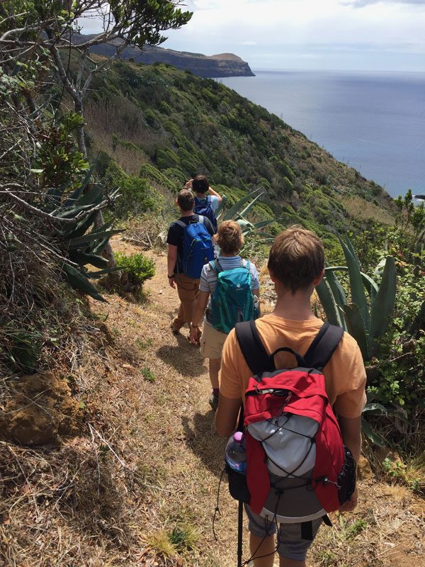 Die Gruppe lacht mich aus, als ich am 11. Tag vor dem Hotel auf den Bus warten will. Heute wandern wir direkt vom Hotel aus los – das ist ja auch mal entspannt! Wir gehen durch den Ort Vila do Porto, besichtigen noch kurz das Forte de Sao Bras und starten auf dem Fossilienwanderweg entlang der Küste. Daniel zeigt uns die Stellen mit den Fossilien, im Vergleich zu den anderen Wanderwegen durch üppige Natur ist dieser Wanderweg am Anfang ein bisschen nüchtern, entwickelt sich aber zum schönen Küstenwanderweg und wieder landen wir an einem wunderbaren weißen Sandstrand, der Praia Formosa und gehen baden. Das Highlight dieses Mal: Rund 100 Meter vor dem Strand liegt ein Bootswrack, welches man schon direkt von der Wasseroberfläche aus sehen kann – ein echtes Abenteuer, ohne tief tauchen zu müssen! Abends veranstalten wir unsere eigene kleine Poolparty.