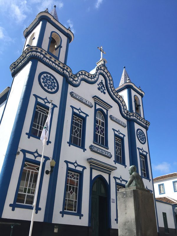 Und wieder ein Tag zum Ausschlafen, erst gegen Mittag ging es weiter nach Santa Maria. Ich nutzte die Zeit, um mir noch einige Kirchen in Praia anzusehen. Unverhofft bekam ich eine Einzelführung von Ibelio und lernte, dass in der Igreja da Misericórdia mit zwei Altären die Schutzpatrone Espirito Santo und Santo Cristo gleichberechtigt verehrt wurden. Die noch prunkvollere Igreja Matriz de Santa Cruz hat mich deutlich mehr beeindruckt als die Kathedrale in Angra am vorherigen Tag. Mittags fuhren wir zum Flughafen und warteten und warteten und warteten auf den Start unseres Fluges nach Santa Maria. Daniel sagte später, dass er das schon häufiger erlebt hatte. Die Azoren-Airlines SATA ist unkompliziert und versorgte uns schnell mit Getränken und Lunchpaketen. Wir hätten es auch nicht ändern können und waren schließlich schon im entspannten Urlaubsmodus. Erst abends fliegen wir. Wir nutzen die Zeit, die Hintergründe zu Roland Kaisers Lied „Santa Maria“ zu erforschen, das in den nächsten zwei Tagen zu unserem Ohrwurm wurde, auch wenn es höchstwahrscheinlich nicht diese Insel „Santa Maria“ beschrieb.