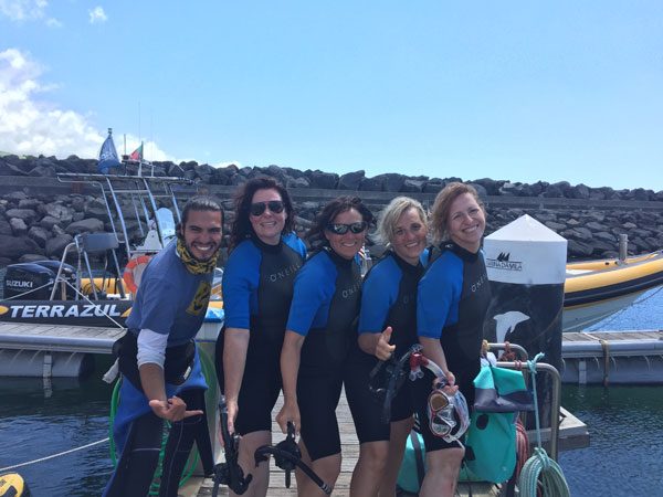 Und schon brechen – leider – die letzten beiden Tage an. Daniel macht uns viele Vorschläge und ein Teil der Gruppe wandert zum Lagoa do Fogo, ein Teil fährt noch einmal mit dem Zodiac Boot raus zum „Schwimmen mit Delphinen“. Heike und ich lachen heute noch, haben wir es leider einfach nicht hingekriegt, uns sanft (und vor allem schnell!) vom Boot ins Wasser gleiten zu lassen, nicht prustend das Wasser aus dem Schnorchel zu pusten und die in Sekundenbruchteilen vorbeirasenden (wilden!) Delphine zu beobachten. Ich hatte mir das „Schwimmen mit Delphinen“ ein bisschen naiv wie bei „Flipper“ vorgestellt, aber natürlich haben wilde Delphine besseres zu tun, als mit Touristen zu spielen.
