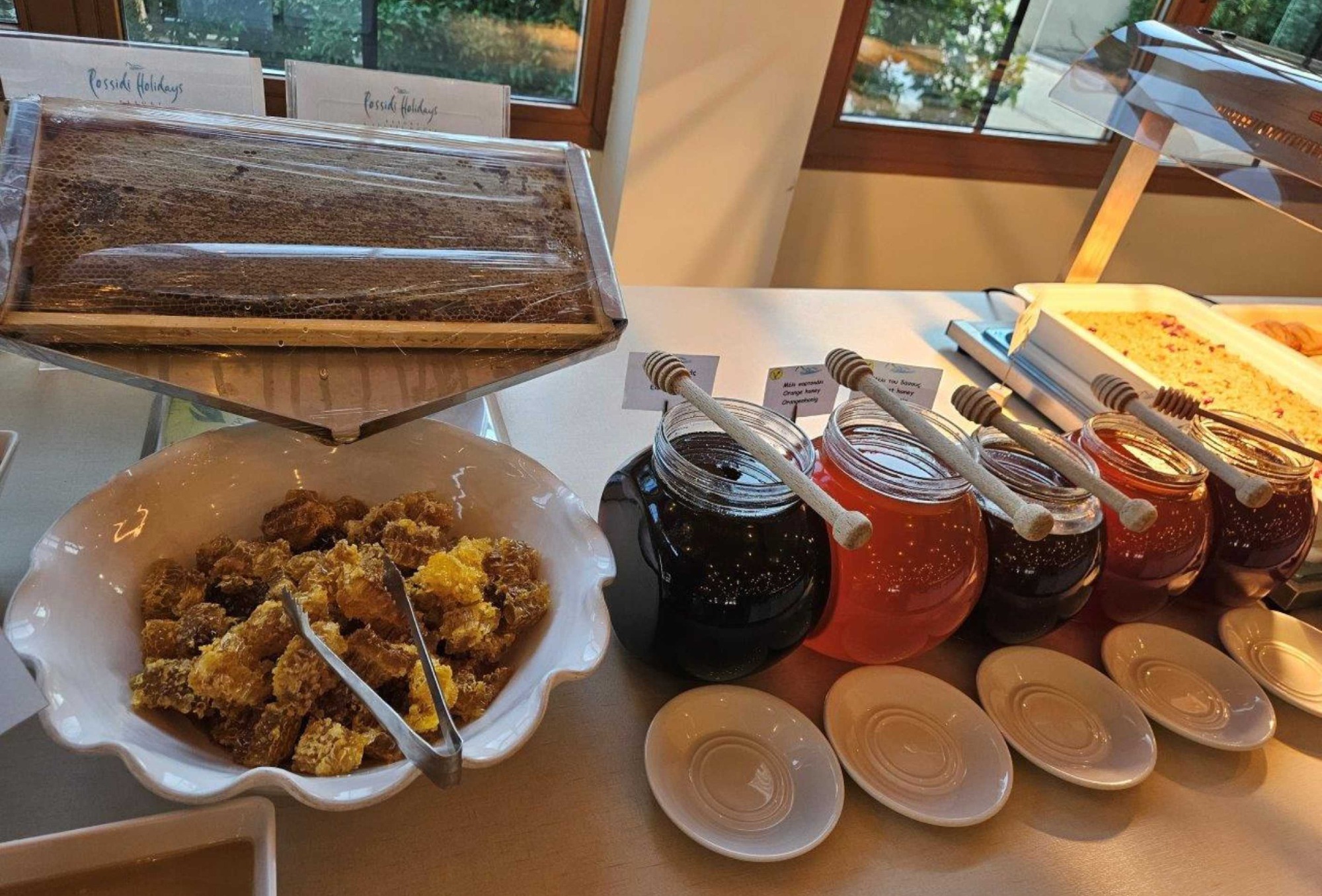 Der Hinflug mit Eurowings verlief reibungslos, obgleich uns die getrennten Sitzplätze etwas verärgerten. Die Wegbeschreibung aus den FROSCH-Reisedokumenten, um auf dem griechischen Flughafen zum FROSCH-Treffpunkt zu gelangen war gut und wir wurden dort schon von einer Dame mit FROSCH-Schild erwartet. Als erste Anreisende an diesem Tag kamen wir schon um 9 Uhr (Griechenlandzeit) morgens am Treffpunkt an. Leider stand für den Vormittag anscheinend nur ein Bus bereit, um alle Anreisenden gesammelt nach Kiopigi und Possidi zu bringen. Da einige Flieger Verspätung hatten, musste wir bis 11:30 Uhr am Flughafen ausharren, bis wir endlich abfahren konnten. Die Fahrt nach Possidi über Kiopigi dauerte nochmals ca. 100 Minuten mit dem Bus. Letztlich kamen wir mit 9 Personen um ca. 13:30 Uhr am Hotel an, wo uns auch schon Marie, eine der Guides, in Empfang nahm. Wir bekamen erste wichtigen Instruktionen, kurze Erklärung der Hotelanlage und den wichtigsten Räumlichkeiten, unbedingt Wasser kaufen im Shop für die Wanderung am Sonntag und vor allem die Handhabung der Toilettennutzung. Alles weitere und mehr Details sollten wir am nächsten Tag beim Gruppentreffen erhalten.