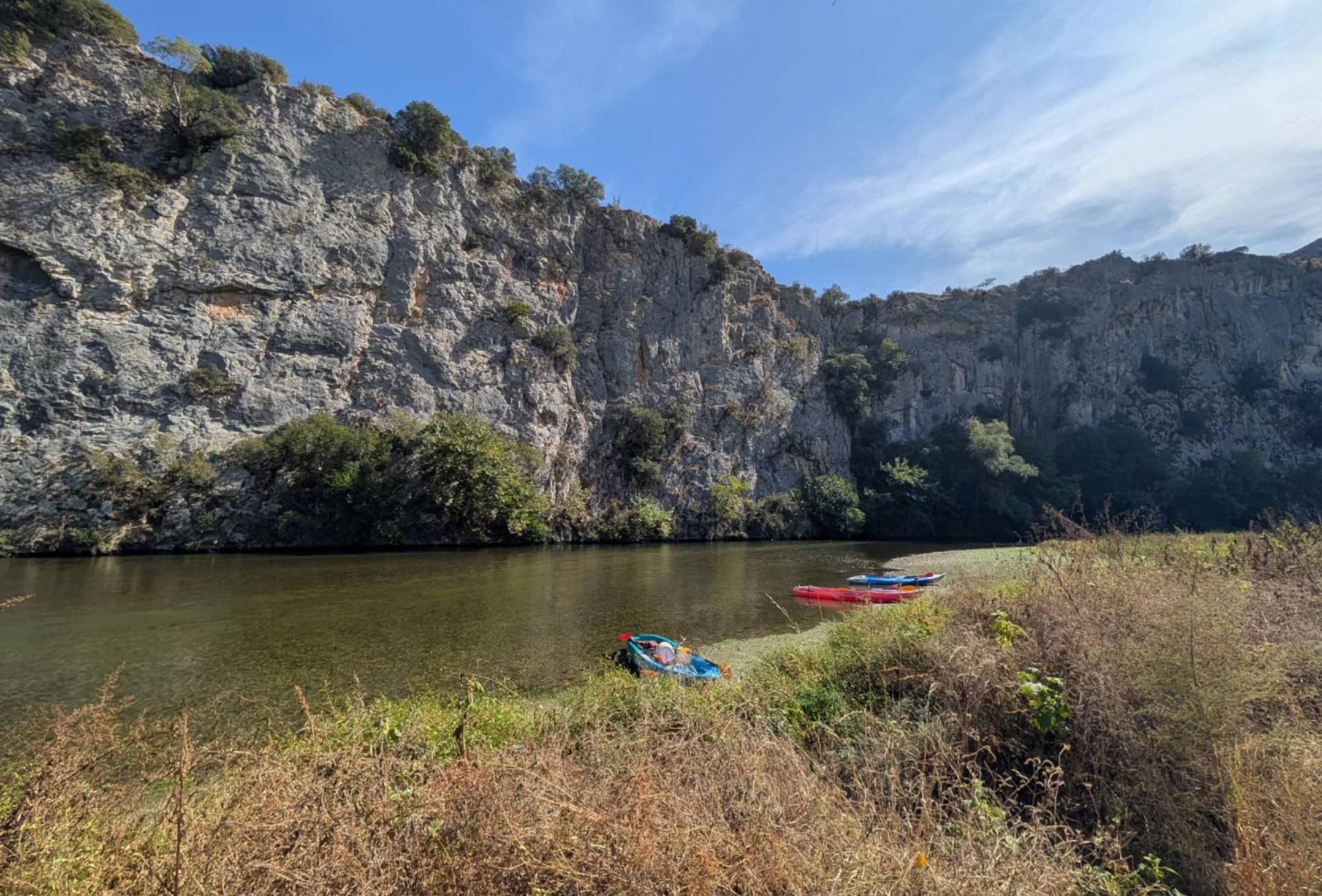 Am letzten Tag haben wir spontan doch noch die angebotene Kanu-Tour auf dem Festland mitgemacht. Erst war ich skeptisch – 12 Stunden unterwegs, einen Tag vor der Rückreise? Aber: Hat sich total gelohnt! Schon die Fahrt war interessant, der griechische Guide hat uns viel erzählt und unterwegs gab’s tolle Ausblicke aufs Festland. Die Paddeltour selbst war landschaftlich ein Traum: 21 km durch eine Schlucht, komplett in der Natur, ohne Straßen, ohne Menschen, nur wir acht Frosch-Gäste in unseren Zweierkajaks. Dank Strömung war es körperlich nicht anstrengend, eher ein bisschen zu gemächlich – aber dafür sehr entspannt. Unser Guide war super sympathisch, hatte kleine Überraschungen parat (z.B. griechischen Frappé und Snacks) und sorgte für gute Stimmung.