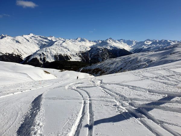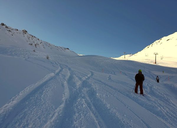 Vom obersten Schlepplift gelangt man zu einer schönen Skiroute (Nr.12), die am Ende wieder zur Bergstation Madrisa führt, bei Neuschnee sehr zu empfehlen.