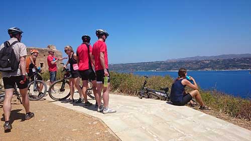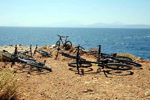Tour 4: Zum Castel und Ausgrabungsstätte in Aptera: ca. 35km weit, meistens Straße, lange Steigung 400 Höhenmeter. Oder die Stock und Stein Hardcore-Tour, die fast ausschließlich über Feld und Schotterwege geht und sämtliche Hügelchen der Gegend abgrast. Sie hat ein langes Stück mit 20% Steigung und geht bis auf 550m hoch. Sie ist mit 55 km und gesamt 1.500 Höhenmetern mit Abstand die härteste Tour (heftig).