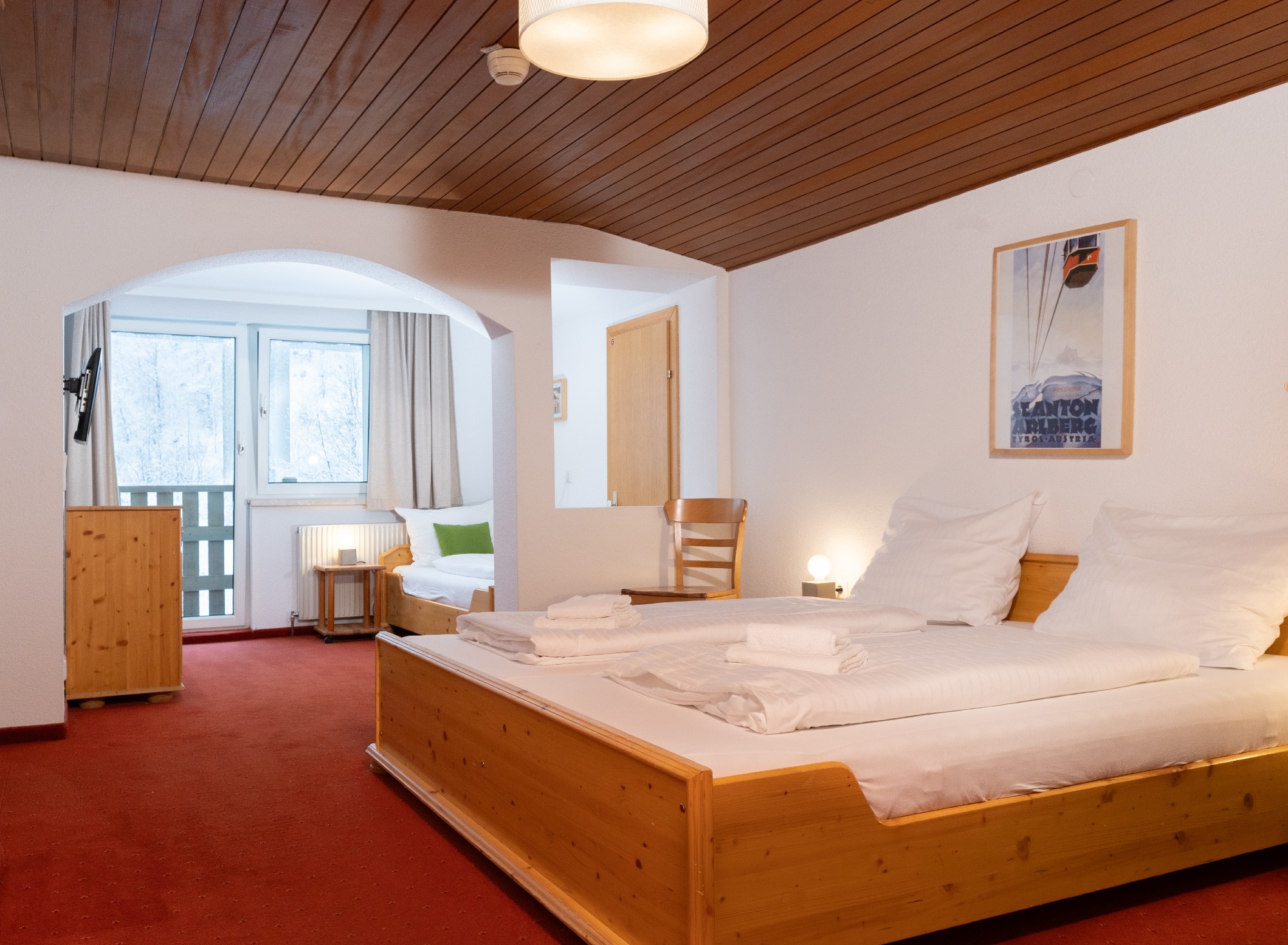 Sportclub Arlberger Hof. Der Arlberger Hof mit insgesamt 28 Gästezimmern bietet alles, um sich rundum wohlzufühlen. Der rustikale Speise-/Aufenthaltsraum mit Bar sorgt für eine lockere, gemütliche Atmosphäre. In der Almrauschbar, dem hauseigenen Partykeller, können wir beliebig feiern, ohne zu stören. Die großzügige Sauna kann kostenlos genutzt werden. Die Zimmer sind freundlich und zweckmäßig eingerichtet, teilweise mit kleinem Balkon. Einige wenige Zimmer mit Etagendusche und separatem WC.