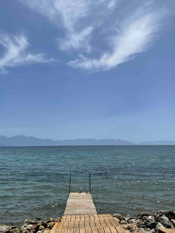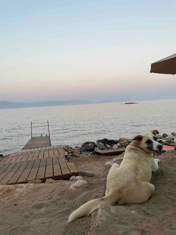 Zu den Mahlzeiten trifft man sich an zwei langen Tischen im Innenhof oder an Tischen auf der Terrasse mit Meerblick. Meerblick den ganzen Tag. Das Hotel ist direkt am Meer. Die Anlage ist klein und somit auch der Strandbereich winzig aber ausreichend. Ich fand es herrlich so nah am Meer zu sein.