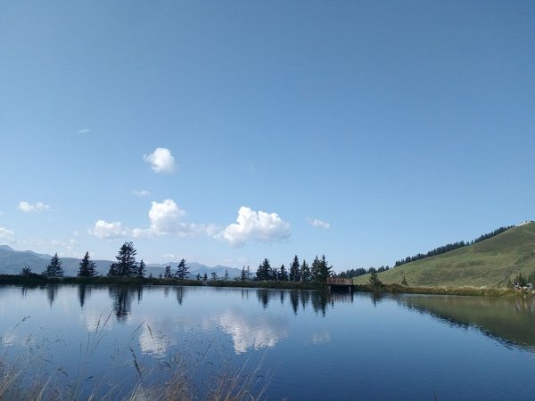 Am Samstag gab es länger Frühstück wie an den vergangenen Tagen und da auch wieder ein sonniger Tag bevorstand, zog es mich mit der Alpenrosenbahn direkt vom Sportclub auf die Bergstation unseres Hausberges. Gemütlich, wieder in Turnschuhen, wanderte ich zum Kreuzjöchelsee und zur Brechhornhütte und genoss das Bergpanorama.