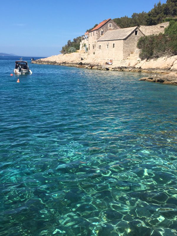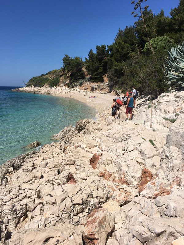 Frühmorgens geht es zu Fuß und bei einigen Fröschen auch mit Wanderstöcken und festem Schuhwerk nach Bol zum Hafen. Hier fahren wir mit einem Taxiboot zu einer schönen Bucht bei Farska. Ab hier beginnt eine malerische Wanderung durch einen mediterranen Wald (mit Pinien, Kiefern, Strauchvegetation) entlang der Bucht Loma und dann schließlich von der Blaca-Bucht zum gleichnamigen, ehemaligen Koster hinauf.
