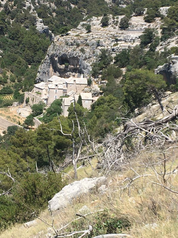 Bei ansteigendem Weg erkennt man, dass das Kloster über einen Wanderweg zu erreichen ist, der an einem trockenen Gebirgsbach (Blaca-Tal) entlang verläuft. Die vorherigen Bewohner des Tals haben diesen Gebirgsbach an den Seiten gut mit Steinen befestigt. Durch diesen Bach werden bei starken Regenfällen große Wassermassen ins Tal bzw. Richtung Meer (Blaca-Bucht) stürzen. Immer weiter nach oben steigend erreichen wir eine Stelle, von der wir dann das Kloster erblicken – der Blick ist atemberaubend.