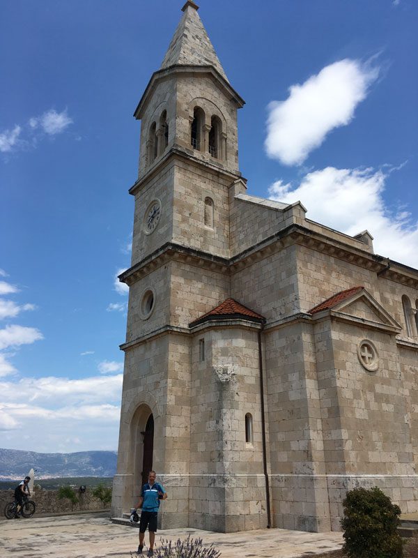 Über die Hauptstraße fahren wir stetig ansteigend auf die Hochebene von Brac. Von hier oben haben wir einen ersten wundervollen Blick auf die Nachbarinsel Hvar. Über die Hochebene radeln wir auf einer Landstraße weiter auf das Dorf Gornji Humac (Dorf der Ziegenhirten) zu. Kurz nach dem Dorf geht’s dann weiter über Schotterpisten, die durch landwirtschaftliche Flächen (Olivenbäume, Getreidefelder) und entlang von Trockenmauern führen, in Richtung Pucišca, die Stadt der Bildhauer.