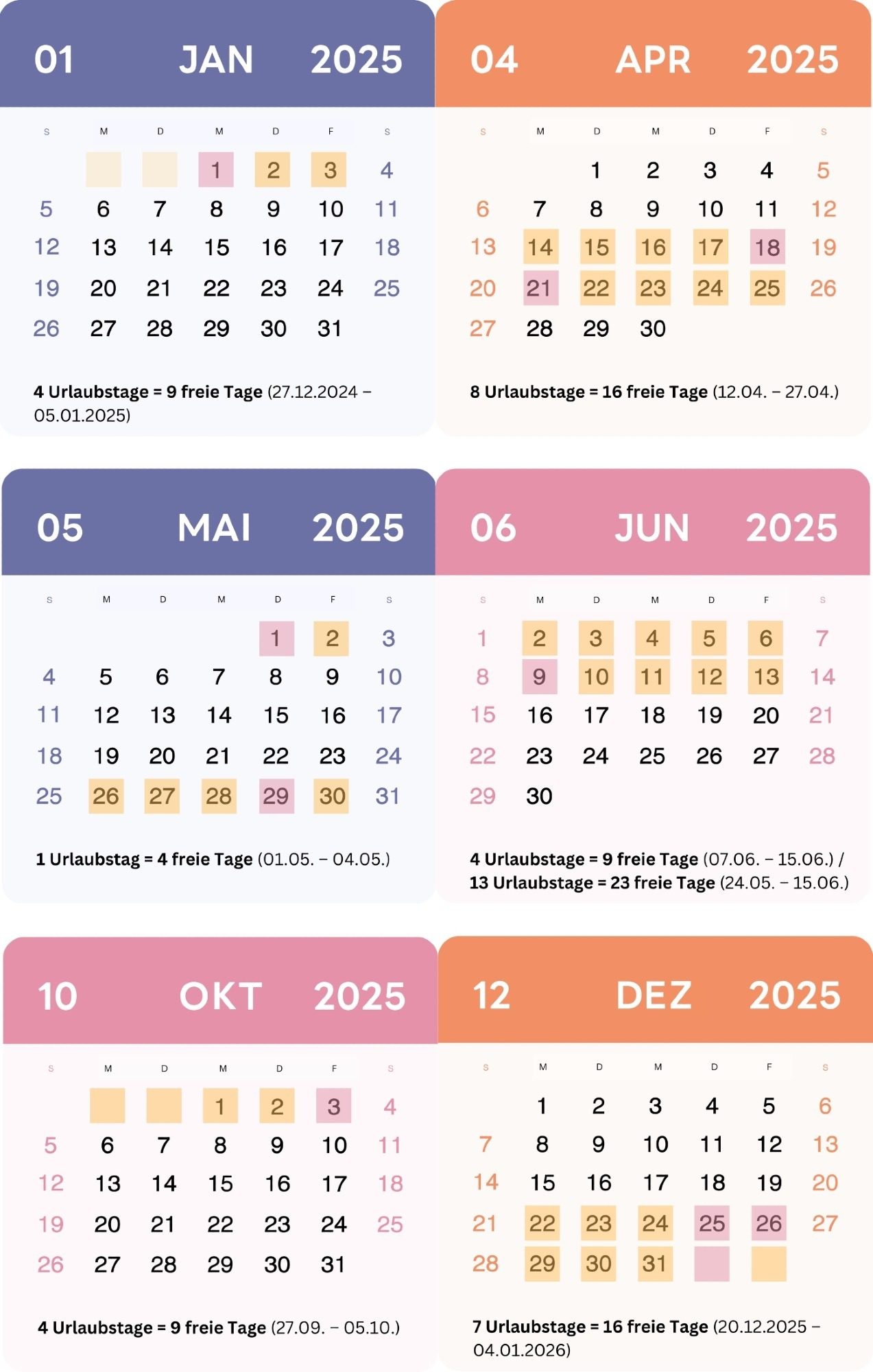 Nicht mehr Urlaub nehmen, sondern besser planen! Feiertage und Brückentage machen auch 2025 wieder mehr freie Tage möglich – wenn du sie geschickt nutzt. Mit der richtigen Planung kannst du deine Urlaubstage maximieren und dich auf längere Auszeiten freuen.