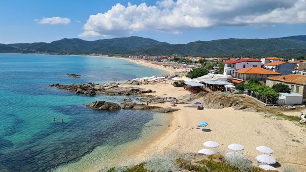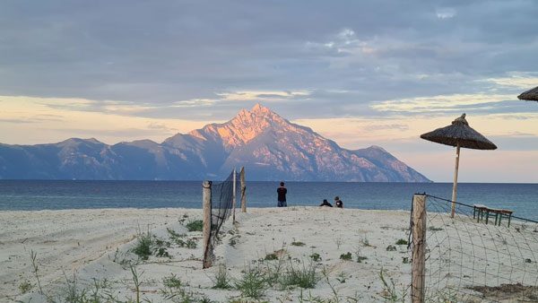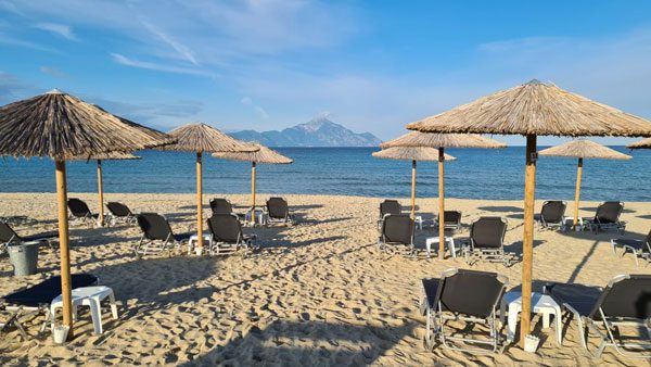 Der Bus-Transfer bringt uns in gut zwei Stunden vom Flughafen Thessaloniki auf die Halbinsel Sithonia, wo das Hotel direkt am Strand gelegen ist. Mit unserem Flugzeug aus Köln sind wir die letzten Gäste und können gerade noch zu Abend essen, bevor das Buffet auch schon abgebaut wird. Danach gibt es noch ein erstes Bier an der Strandbar, aber wegen des ungemütlichen Wetters ziehen die meisten Gäste sich früh zurück.