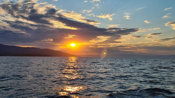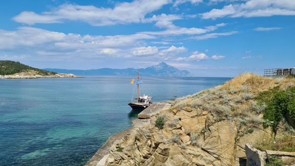 Ebenfalls gegen Zusatzkosten gab es mittwochs zwei Bootstouren auf einem kleinen Motorsegler, die eine tagsüber, die andere in den Sonnenuntergang hinein. Da sich das mit der Mountainbiketour kombinieren ließ, habe ich mich für den Sunset-Trip entschieden und es war wirklich schön, nach zwei Badestopps und Abendessen an Bord die Sonne über dem Meer versinken zu sehen. Das Hotel liegt dazu auf der „falschen“ Seite von Sithonia. Hier kann man die Sonne früh morgens hinter dem Berg Athos aufgehen sehen – wenn man denn zeitig genug aus den Federn kommt.
