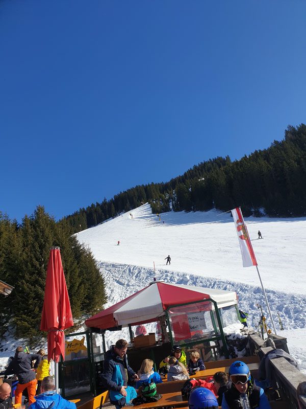 Die erste Mittagshütte sonntags, das „Bergstadl“, ist aber problemlos auf zwei Wegen ohne Ski zu erreichen.