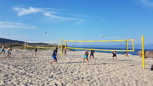 In Sarti finden fast den ganzen Sommer, außer in der Hauptferienzeit, Beachvolleyball-Camps statt. Ich habe auch dieses Mal wieder daran teilgenommen. Wir hatten eine wirklich tolle, recht homogene Gruppe auf gutem Niveau. Allerdings finde ich die Gruppengröße von 10 Leuten schon am Limit, so bleibt wenig Zeit für individuelle Korrekturen. Für Einsteiger und Hobbyspieler, die ihren Schwerpunkt im Urlaub nicht auf Beachvolleyball setzen, sind die Camps sicher gut geeignet, jedoch nicht zu vergleichen mit denen von einschlägigen Veranstaltern. Die 4 Beachvolleyball-Felder sind leider nicht gut gewartet, werden nicht abgezogen, so dass sich tiefe Kuhlen bilden und der Sand teilweise so weggetreten ist, dass man sich auf dem harten Untergrund verletzt. Außerdem sind die Pfosten nicht ummantelt, was ebenfalls ein Verletzungsrisiko birgt. Die beiden zum freien Spiel zur Verfügung stehenden Felder sind auch am Nachmittag sehr stark frequentiert, so dass man teilweise länger warten muss, um einen Satz spielen zu können.