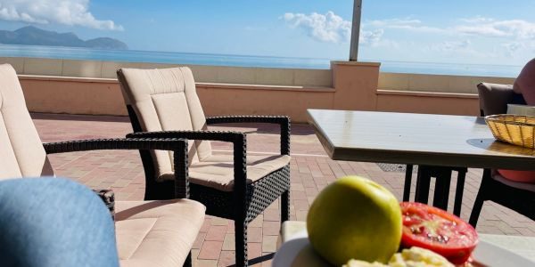 Da ich spät angekommen bin, kam ich zum Abendessen. Dieses fand auf der Terrasse statt, von dort aus kann man das Meer sehen. Es liegt direkt an der Promenade, und hinter dem Hotel gibt es eine Einkaufsstraße, die alles bietet, was man braucht. Zudem war Lidl ein Katzensprung entfernt von uns, bei dem man frisch gepressten Orangensaft für einen günstigen Preis kaufen kann.