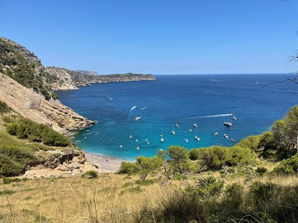 Solche Touren haben wir dann am froschfreien Mittwoch auf eigene Faust gemacht. Wirklich empfehlen können wir eine Tour über Alcudia zur Bucht Platja des Coll Beix. Oben stellt man das Rad ab und läuft ca. 40 Minuten bergab auf einem herrlichen Wanderweg zur Bucht, die man mit festem Schuhwerk und Trittsicherheit über einen Kletterpfad über Felsen erreicht. Dort haben wir uns beim Baden abgekühlt, mussten aber auf unsere Rucksäcke aufpassen, über die sich wilde Ziegen hungrig hergemacht haben.
