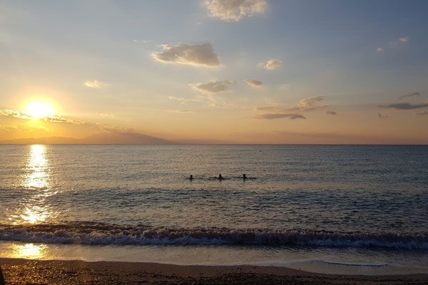 Am Strand stehen kostenfreie Liegen und Schirme zu Verfügung, eine Bar serviert Getränke und Snacks bis zur Liege. Das Wasser glitzert türkisblau, jeder Tag endet mit einem traumhaften Sonnenuntergang. Lediglich ein paar Kieselsteine erschweren das Laufen ins Meer. Zum Zeitpunkt meiner Reise befanden sich hinter dem Strandabschnitt einige Beachvolleyballfelder, die rege benutzt wurden, ich habe dies nicht als störend empfunden, sondern habe gerne zugeschaut und angefeuert.