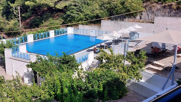 Die Zimmer sind typisch für Frosch in Griechenland: sauber, simple, ohne TV, kein Luxus – aber völlig ok. Als Ergänzung zum Hotel gibt es noch die schräg oberhalb davon gelegene Dependance mit einer wundervollen Aussicht Richtung Meer und Kokkari. Die Zimmer zur Meerseite haben zwar morgens Sonne, liegen aber ab mittags im Schatten, so dass man dort dann auch auf dem Balkon oder der Terrasse sitzen kann.