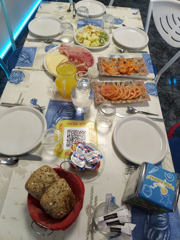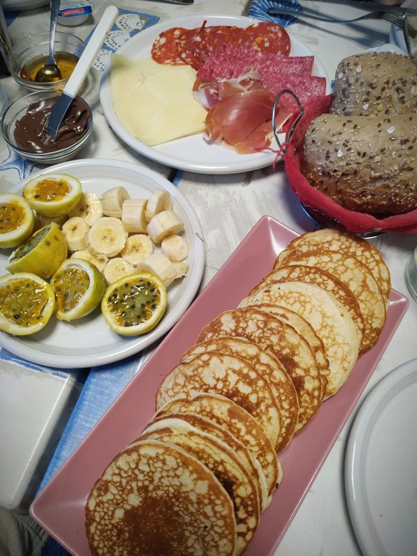 - In unserer Urlaubswoche gab es aus bestimmten Gründen nicht die Möglichkeit einen Frühstückskorb zur Selbstverpflegung zu buchen, daher haben wir tagtäglich gemeinsam in einer Frühstücksbar gefrühstückt. In der Zeit von 8-9 Uhr gab es in einer Bar ca. 5 Minuten Fußweg entfernt für jeden Gast Brötchen, Rührei, Aufschnitt, Obst, Kaffee, frischen Orangensaft und oft auch ein kleines Highlight wie Pancakes, Räucherlachs oder ein nettes Lächeln vom Besitzer.
