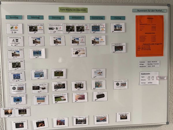 Zum ersten Mal in Sarti wurden die Familienreisen von den Normal-Reisenden getrennt. Wir hatten eine andere Lokalität zum Essen, eine andere Aktivitäten-Tafel, einen anderen Wander- und Bikeguide, usw.