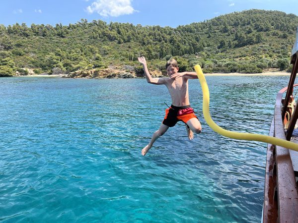 Die Kinder waren Wandern (mein kleinerer hasst wandern, ist aber „brav“ mitgegangen), haben Strandspiele gemacht, eine Chaos Rallye (im Dorf Sarti), und auch Aktionen mit den Eltern (die, die wollten). Am besten fanden wir alle das Spiel „Capture the flag“ über den ganzen Campus, das Spiel „Werwölfe“ am Lagerfeuer am Strand und die Mottopartys (alle Kinder (!!) haben mitgemacht!).