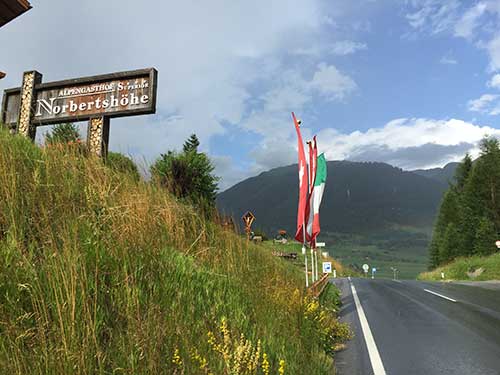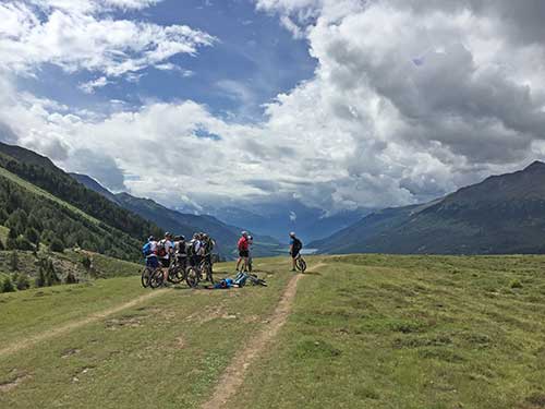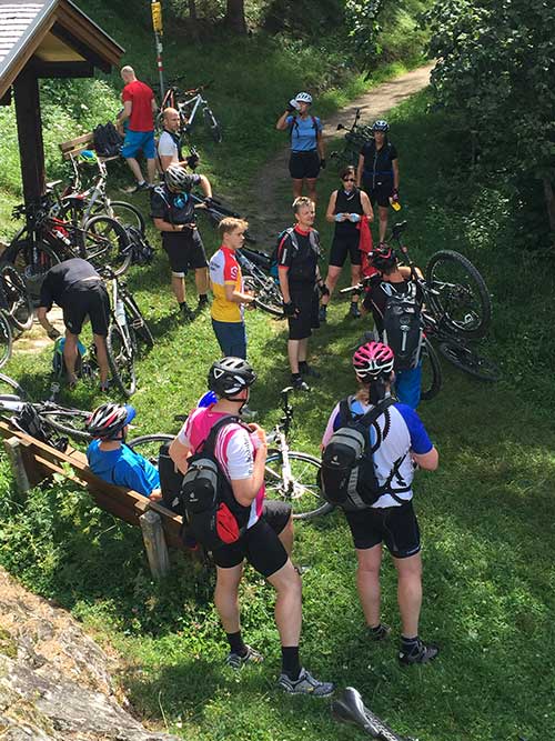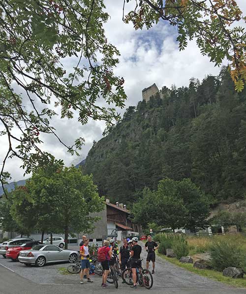 An diesem Morgen begegnet uns statistisch eher Unmögliches: während der ersten 8 km mit diversen kleineren Auf- und Abstiegen auf schönen Wald- und Radwegen um die 880 - 1.000 m-Marke hält uns eine dreimalige Vorderreifenpanne an ein und demselben Rad deutlich auf - wir nehmen diese zeitraubende Misere mit Humor und freuen uns, dass dies vor dem folgenden, steilen 200 m-Anstieg über kurze Distanz auf 1.100 m passiert ist - auf dieser Höhe mit fantastischen Panoramen bleiben wir die nächsten 6 km auf der alten Römerstraße Via Claudia Augusta, um uns dann über eine lange Abfahrt auf 750m fallen zu lassen. Zur Mittagspause im „Wilden Mann“ in Tösens bei KM 30 sind wir dann wieder langsam und gleichmäßig auf 900 m Höhe angekommen. Der Nachmittag gehört eher den asphaltierten Strecken - über Radwege und Straße kommen wir mit kurzem Abstecher in die Schweiz gemütlich über 18 km auf 1.000 m Höhe, um dann nach einem kurzen 100 m-Peak zum Üben in die 12 Kehren hinauf nach Nauders einzusteigen - 7 km konstante Steigung auf am Ende 1.400 m. Der leichte, kurze Sommerniesel am Ende ist willkommene Kühlung, und nachdem alle oben angekommen sind, lassen wir uns in den Ort hinunter rollen und spannen nach diesen nachmittäglichen 30 km aus. Tipp: Nauders ist der erste größere Ort mit Bankautomaten und Supermarkt.