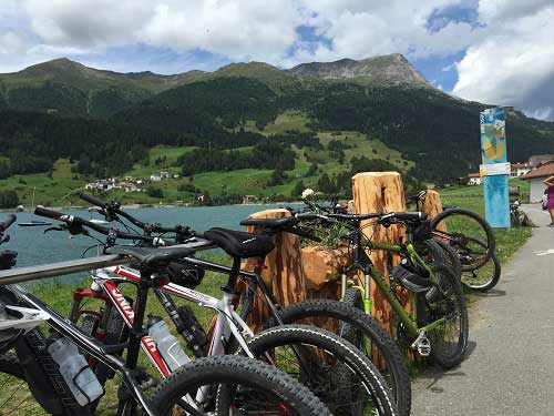 Der Tag fängt für die Light-Gruppe nicht wirklich hart an und wird es auch am Ende nicht sein - die kurze Anfahrt zur Bergbahn in Nauders lässt uns lächeln, und wir lassen uns jeder einzeln mit dem Bike hinten an der Gondel die 750 Hm auf 2.100 m hinaufbringen, um der sich in Serpentinen unter uns hinauf kämpfenden Sport-Gruppe zuzuwinken. Oben angekommen erwartet uns nach kurzer Fahrt über Schotter ein jadefarbig schimmernder Bergsee zum ersten Fotostopp, bevor es dann über schöne Singletrails an den Panzersperren aus dem 1. Weltkrieg vorbei zu einem letzten Aussichtsfels mit umwerfendem Fernblick geht. Mit Jacken gegen Abfahrtskühle geht es dann rasant über 10 km auf Schottertrails und am Ende etwas Asphalt von 2.100 auf 1.500 m hinunter - die Bremsen sind deutlich zu riechen. Die Cappucinopause unten am Reschensee führt die Sportgruppe zu uns, die zu unserem Spaß allerdings Einkehrverbot von Piotr verhängt bekommen haben... Wir bleiben weitere 15 km auf dieser Höhe, um uns dann an der Etsch und Apfelplantagen entlang noch einmal über 10 km auf 900 m hinunterrollen zu lassen und zur Mittagspause in der Krone in Laas anzukommen. Die Marillen-Topfenknödel sind ein wuchtiger Traum und lassen erahnen, warum die Krone im Gault&Millau erwähnt wird...die letzten 11 km zum Hotel nach Coldrano sind jedenfalls nicht geeignet, sie wieder abzuarbeiten ;) Das Hotel empfängt uns mit einem Indoorpool und Sauna zum Relaxen, was wir nach dem Gang zum schräg gegenüberliegenden Supermarkt und einer erfrischenden Dusche auch ausgiebig in Anspruch nehmen. Die von den Guides angepriesene Pizza ist tatsächlich sehr lecker, und zusammen mit den anderen Gängen des Menüs ist auch heute hoch wahrscheinlich wieder gerade einmal das Gewicht gehalten, aber sicher nichts abgenommen worden.