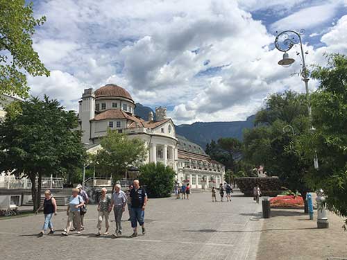 Der Morgen fängt wieder entspannt an - nach dem Einkauf von Lebensmitteln für das geplante Nachmittag-Picknick lassen wir uns über die ersten 25 km von 650 m auf 500 m heruntertreiben, um dann allerdings steil wieder auf 650m hinauf zu fahren, ein paar km auf dieser Höhe auf- und absteigen und dann sehr steil über nur 2 - 3 km fast 400 m Abfahrt genießen, bevor wir mittags in Meran, meinem persönlichen Städtehighlight auf dieser Transalp, ankommen. Ich nutze die Gelegenheit zu einem kurzen Abstecher ins Meraner Weinhaus, um mir ein paar lokale Weine als Souvenir nach Hause schicken zu lassen, und genieße danach mit der restlichen Gruppe das Eis an der Uferpromenade und den kleinen Rundgang durch die Stadt. Es geht sonnig weiter durch's Vinschgau an der Etsch entlang, und wir vertreiben uns die Zeit mit Windschatten-Fahren unter praller Sonne...dass es italienische Rennradfahrer nicht mögen, wenn ihnen drei MTB'ler auf einer langen Geraden mit einem Spurt folgen und sie dann auch noch der Reihe nach überholen, stellen wir mit einem Grinsen bei einem ebensolchen Test fest ;) Irgendwann merken wir dann allerdings, dass die gestern fehlenden 12,5 km heute mit 27 Zusatz-km „gebüßt“ werden müssen. Das Picknick verschiebt sich deutlich nach hinten, und statt nach 60 km Tagesstrecke am Ziel zu sein, bekommen wir einen Anstieg über 10 km von 250 m auf 600 m ans Herz gelegt...ausgehendes Wasser füllen wir an einer dörflichen Feuerwehr-Station nach, und nach letzten Anstiegs-Metern kommen wir endlich am Kalterer See an, um das verdiente Picknick und die Abkühlung am und im See zu genießen. Die letzten 17 km danach führen uns wieder auf 200 m zurück, und wir lassen uns abends entspannt in die Stühle des Hotel „Elefant“ in Auer fallen und den Tag ausklingen, woran uns auch der kleine Regenschauer während des Abendessens nicht hindert.