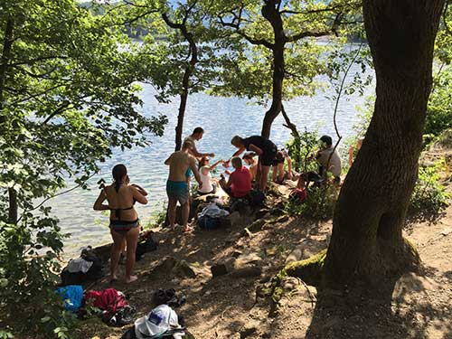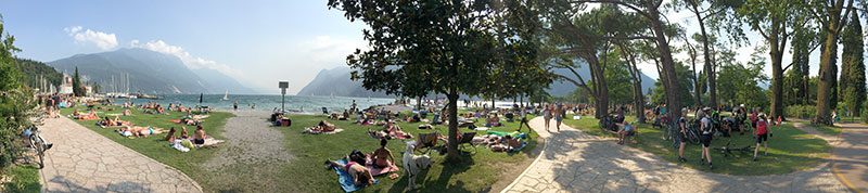 Etwas Wehmut schwingt mit, als wir uns das letzte Mal auf dieser Tour auf die Räder setzen...das Ziel Riva del Garda vor Augen, machen wir uns auf die 58 km lange Schlussetappe, die zu einem „Best of“ werden soll: die ersten 10km dürfen wir uns bei schwüler Hitze leise fluchend von 200m auf 800m hinauf arbeiten, genießen de letzten Fernblick über ganz Trento und Umgebung plus einen Cappucino in einem kleinen Bergdörfchen und rollen dann 6km auf 400m hinunter, bevor es noch einmal 100m hinauf geht. Wir gehen auf 250m herab und treffen kurz nach Padergnone im Giardino delle Spezie zur Mittagsrast auf unsere Sport-Gruppe, die sich vor uns wieder auf den Weg machen. Nach Genuß der uns von Guide Piotr warm empfohlenen Pizza „Anna“ geht es weiter, wir fahren schöne Trails als auch asphaltierte Wege und treffen dann vor Arco auf einem Trail wieder auf die Sportler, um den Rest der Tour gemeinsam zu Ende zu fahren. Der Eisstopp in Arco ist uns allen mehr als willkommen, und dann können wir den Lago di Garda fast schon riechen - über enge und bevölkerte Radwege geht es über Linfano an das Seeufer, und endlich in Riva angekommen, gibt es kein Halten mehr - wir stoßen mit dem noch schnell im Supermarkt beschafften Bier an und springen in Bike-Klamotten in den Lago, um unseren Erfolg zu feiern. Der Check-In im Hotel La Perla geht zügig, während des Abendessens im Restaurant Villa Araci wird die Transalp gemeinsam weiter gefeiert und anschließend in der Sailing Bar bei diversen Cocktails und ausgelassener Stimmung gebührend beendet...