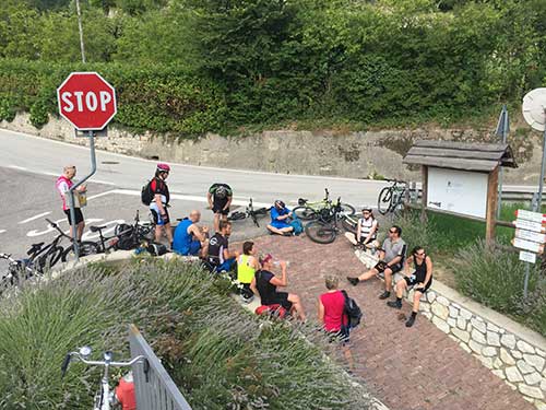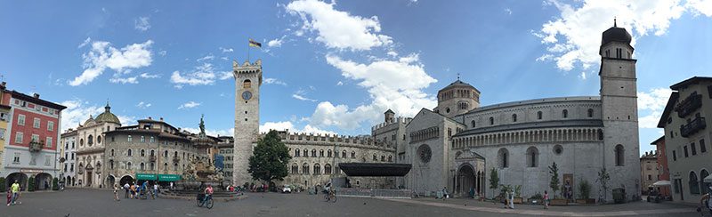 Die Passage aus dem Skript „...genießen wir die schnelle Fahrt entlang der Etsch nach Trento“ stimmt - allerdings ist man gut beraten, sich für die ersten 10 km auf einen direkten Anstieg um 400 m einzustellen, dem dann ein mehrstufiger Abstieg über 5 km auf wieder 400 m hinunter zurück auf 200 m folgt. Hat man dies im Aufwachmodus absolviert, steht den folgenden 35 km schneller Fahrt tatsächlich nichts mehr im Weg. ;) Die Strecke führt uns durch idyllische kleine Bergdörfer, über schöne Trails mit verschiedenen Anforderungen und sorgt so für einen abwechslungsreichen Tourtag, der nach 50 Tages-km vor dem Eiscafé Grom auf dem Marktplatz in Trento endet. Bacio und Fior di Latte im Becher machen sich extrem gut zur Abkühlung, und nachdem wir entspannt im nahe gelegenen Hotel eingecheckt haben, machen wir uns auf den Weg und erkunden die Stadt in kleineren Grüppchen auf eigene Faust. Das Abendessen im Hotel hinter uns, gehen wir dann noch einmal mit unseren Guides auf einen Vino zum Marktplatz zurück und lassen die bisherigen Erlebnisse Revue passieren.